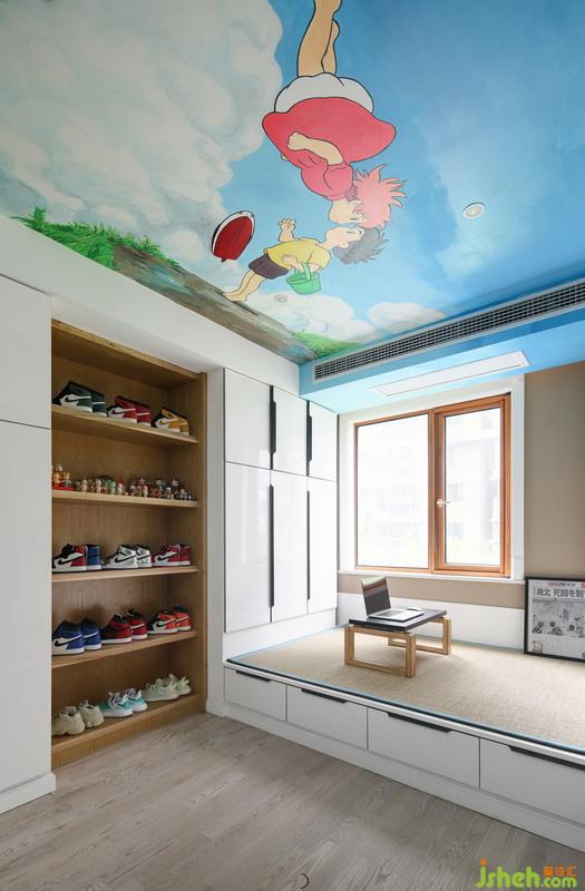 這個(gè)朝北的房間其實(shí)屬于機(jī)動(dòng)房間,可以使儲(chǔ)藏室,也可以是兩個(gè)人看投影的房間,也可以偶爾來人的客房,也可以聊天打牌的房間。開放柜中的鞋子只是一部分,早知道有這么多的鞋子,應(yīng)該多做些開放柜。頂部是請(qǐng)朋友來畫的丙烯顏料墻繪,挺漂亮,給人感覺很甜蜜。