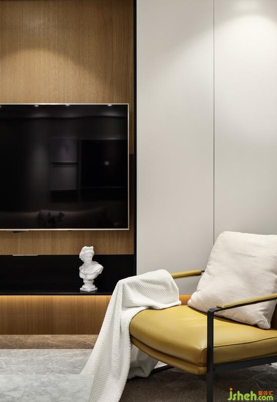 室內(nèi)設(shè)計(jì)師放棄傳統(tǒng)的電視柜,木色、白色比例合理,空間簡(jiǎn)約干練。