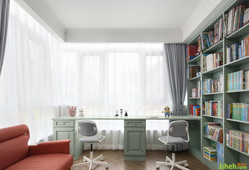 兒童房空間,考慮家中兩個寶寶要有充足的活動空間,所以將兒童房旁的露臺也納入了室內(nèi)整體設計,規(guī)劃出了包含睡眠區(qū)、休息區(qū)、娛樂區(qū)于一體的完整起居空間。