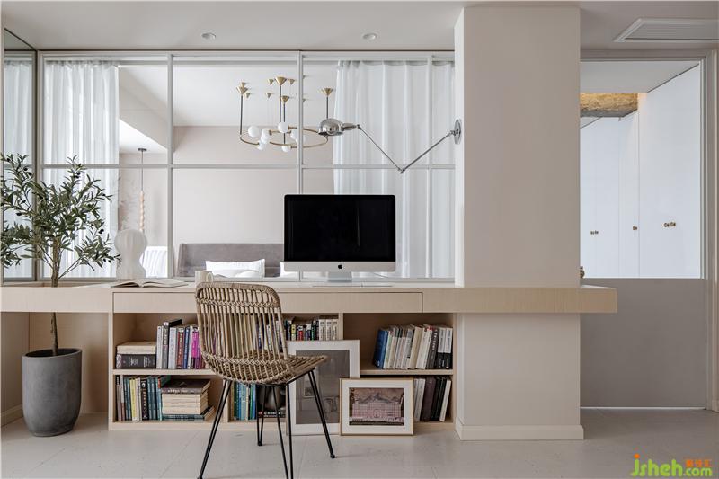 在客廳現(xiàn)場制作可供兩人使用的辦公寫字臺(tái),下方用書柜支撐,寫字臺(tái)也起到劃分客廳與臥室的功能,弱化電視背景,整體為業(yè)主量身打造。寫字臺(tái)下方書柜放置常用備課書籍,客廳與臥室之間僅用通透玻璃紗簾分隔。室內(nèi)設(shè)計(jì)師