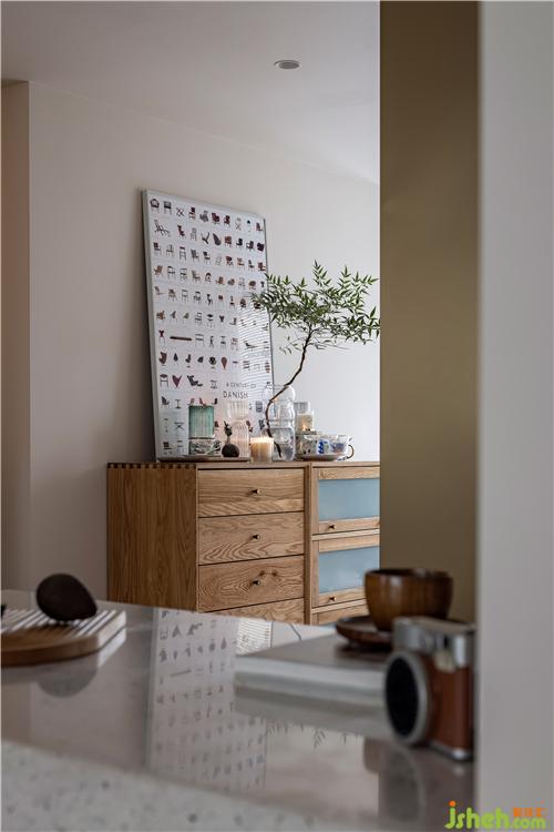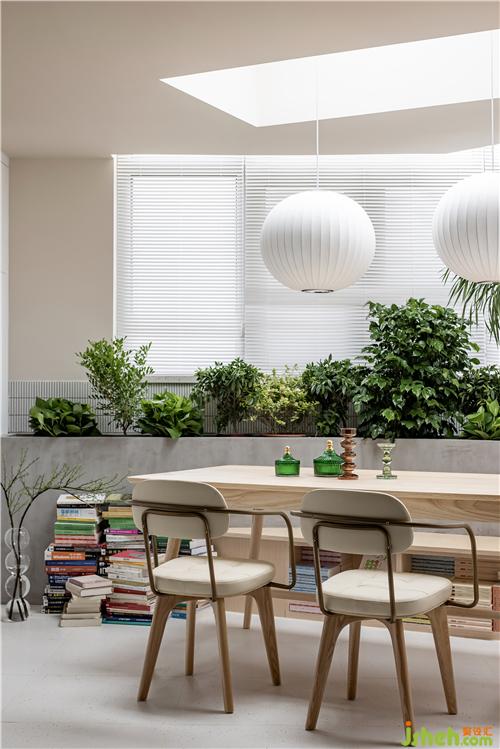 餐廳將戶外陽臺封閉,開設(shè)天窗,增加植物景觀,下設(shè)木制卡座,集合書柜,搭配原木色餐桌與皮制餐椅進行混搭,整體色系將客廳空間與餐廳空間氛圍融合過渡。 餐廳卡座同樣選用原木色搭配,一反復古常態(tài)。