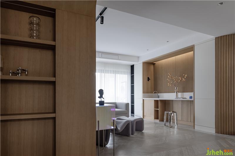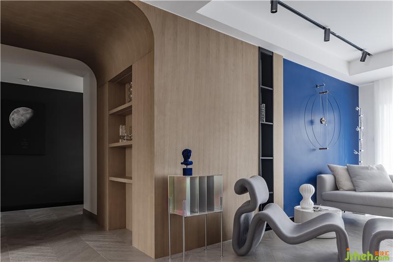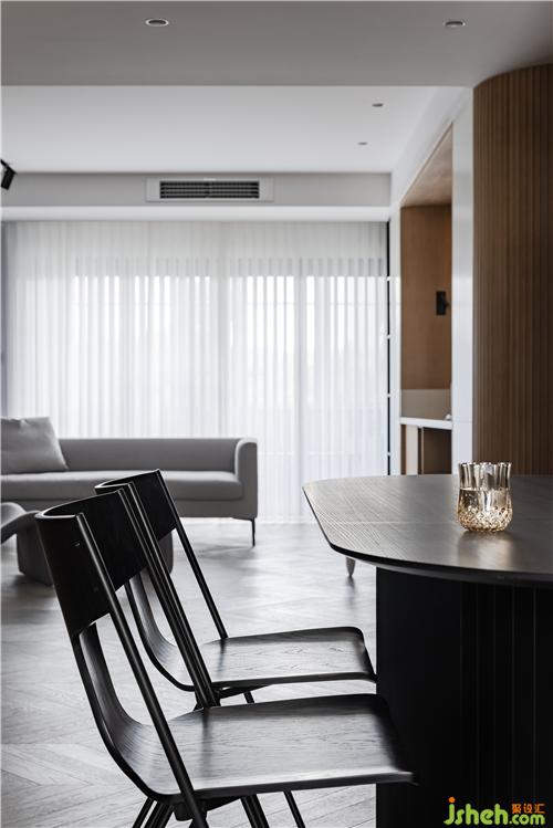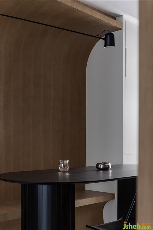 過道吊頂連貫餐廳及客廳的木飾面弱化過道,黑色墻面的運(yùn)用給能平靜的感受。室內(nèi)設(shè)計(jì)師