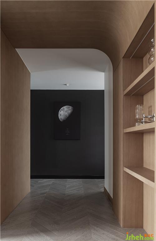 過道處利用原有次臥門洞制作展示功能隔板,暗藏LED燈帶起到照明功能。