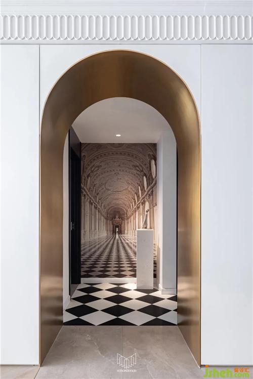 銅色圓拱門(mén)洞加上墻面立體壁畫(huà)、黑白棋盤(pán)格地磚、定制款歐式石膏線(xiàn)條都在渲染整個(gè)空間的品味和格調(diào)。