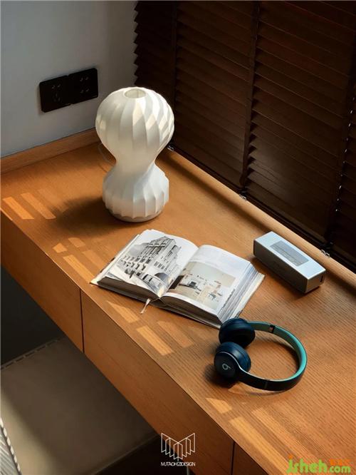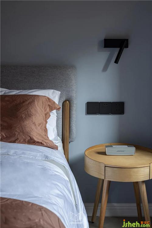 次臥室是業(yè)主的父母房,所以設(shè)計較為穩(wěn)重。窗外的自然光透過木制百葉窗,為空間帶來靜謐和儀式感。