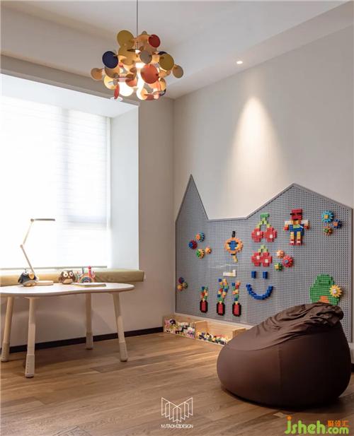 書(shū)房由明亮的三原色組成,樂(lè)高板,黑板墻,積木吊燈,豆丁懶人沙發(fā),讓人忘卻大部分無(wú)意義的煩惱。