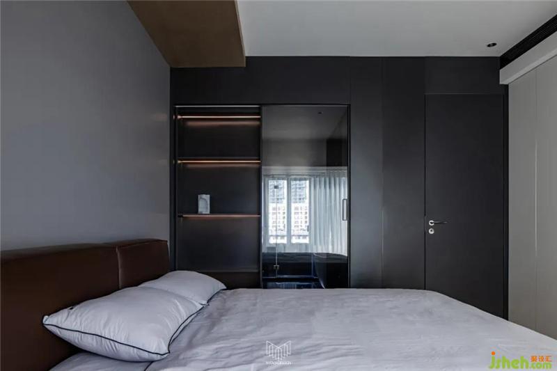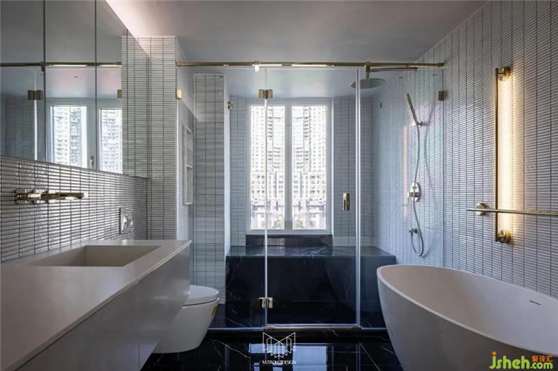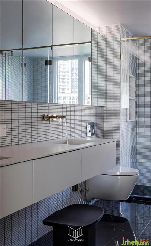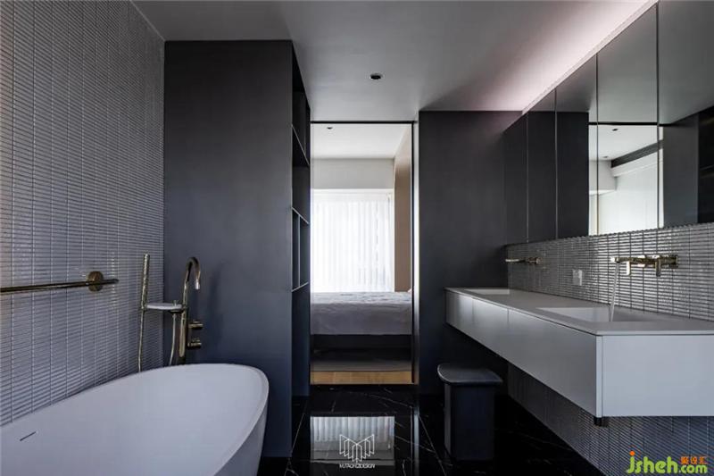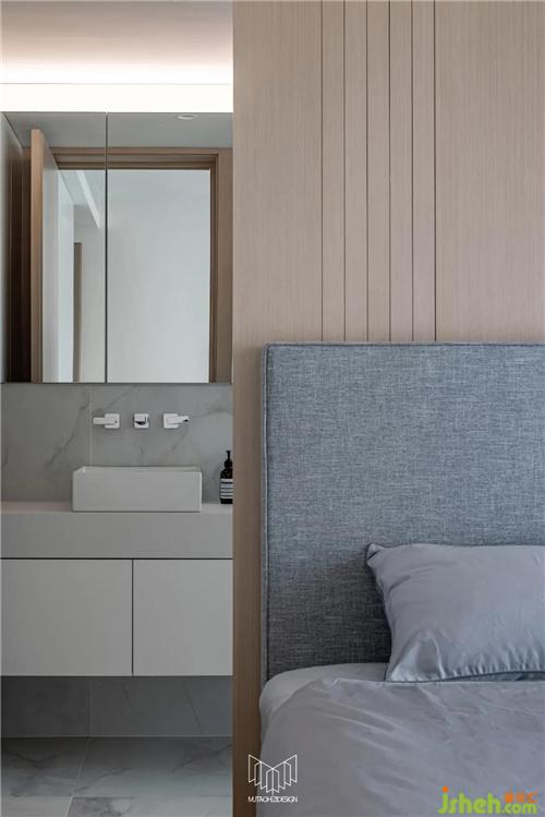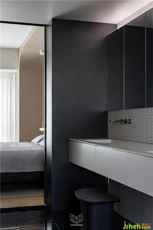 主衛(wèi)墻體拆除后,使用定制柜體和鋼板柜替代隔墻功能,衛(wèi)生間擴大后,功能更加多樣化,不僅滿足基礎盥洗功能,更配備了雙臺盆巖板一體盆和浴缸。定制柜體內(nèi)嵌燈光以襯托整體氛圍,色彩、材質也與主臥室融合呼應,極大了提高了生活品質,形成套房概念。