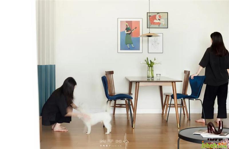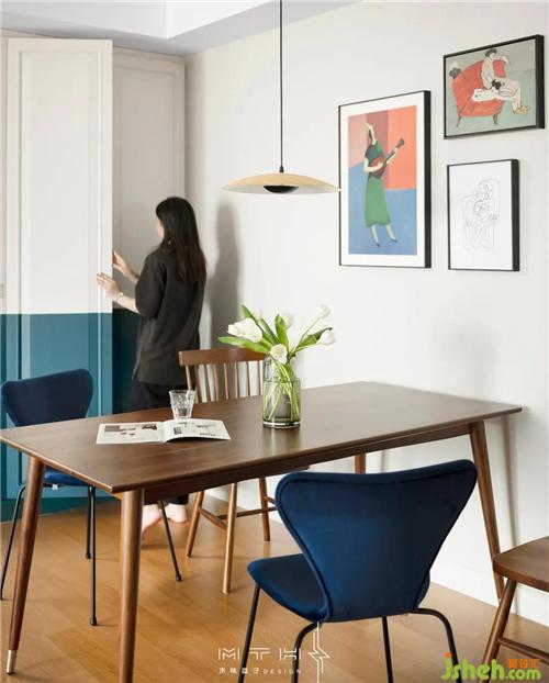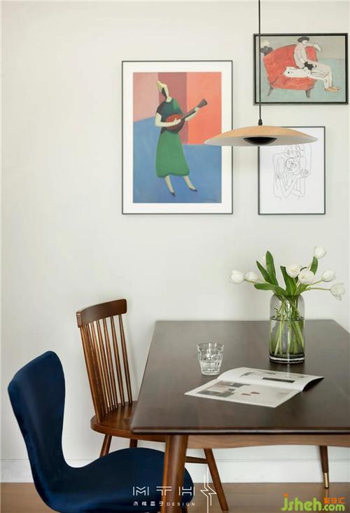 餐廳選用了兩款不同材質(zhì)和造型的餐椅,搭配胡桃木餐桌,既平衡又統(tǒng)一。南京裝修設(shè)計墻面也選擇色彩跳躍的組合裝飾畫,增添了空間的趣味性。