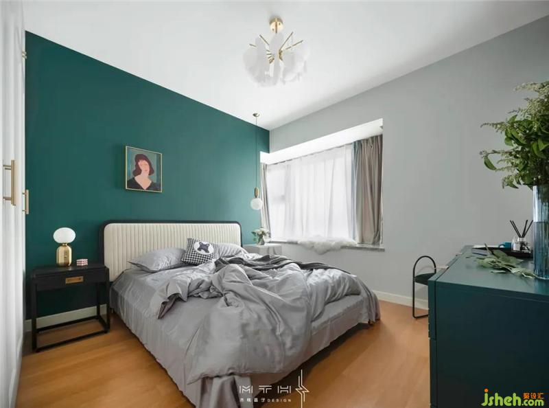 主臥室背景墻整面刷墨綠色乳膠漆,床頭選擇了一幅阿梅代奧·莫迪利亞尼的金色邊框人物肖像畫,畫的背景同樣也是藍(lán)綠色,南京裝修設(shè)計搭配在一起讓墻面更具層次感。床頭兩側(cè)臺燈和吊線燈組合布光,也增加了空間的裝飾效果。
