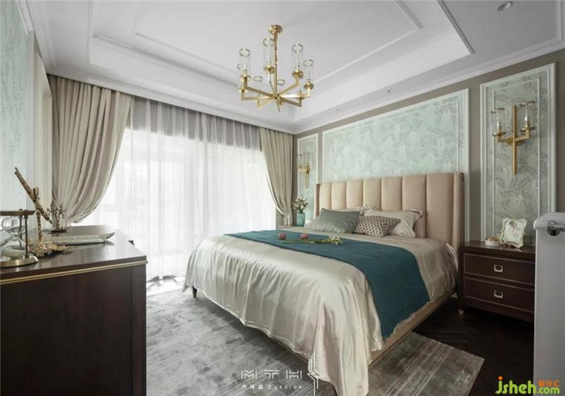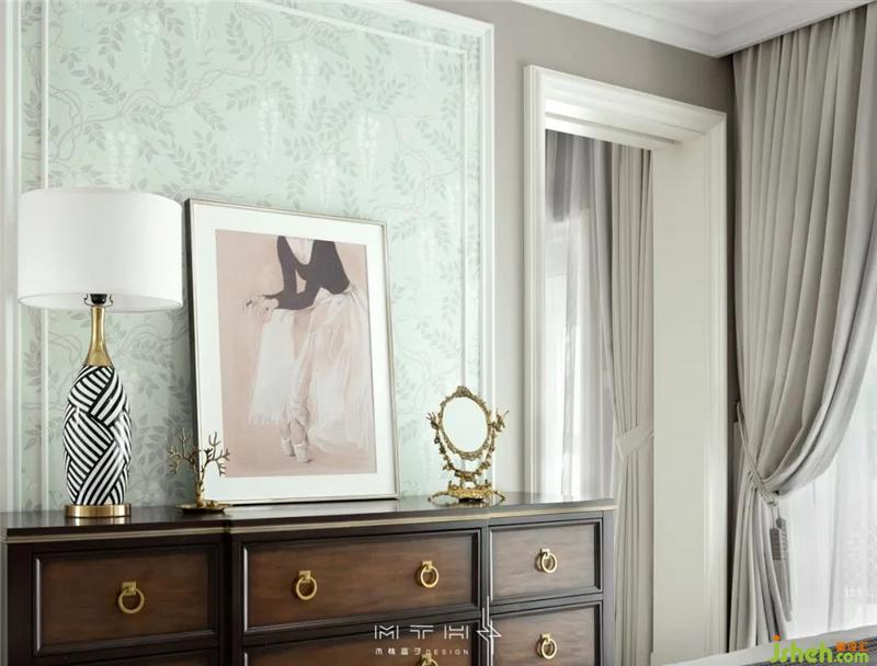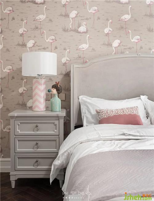 女兒房選用粉色作為環(huán)境色,暖灰色實木家具與白色床品搭配給人寧靜之感,南京裝修設計而床頭滿貼英國Cole&Son的Flamingos系列壁紙則增添了活潑的氣息。