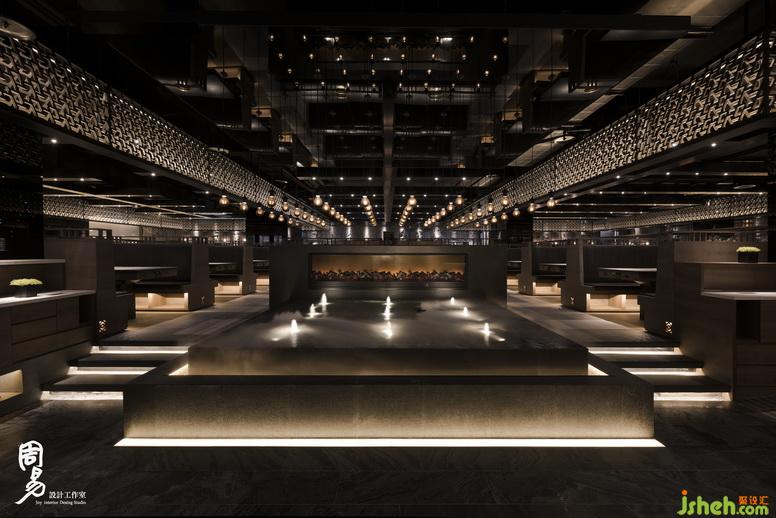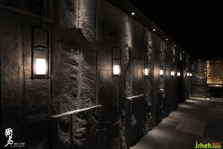 店內(nèi)儼然另一重境界,居中即是復層、高架基座的無邊際景池,池中燈光、波光、氤氳霧氣與上方 陣列燈海交織,后方屏風壁爐火光搖曳,水火同臺競艷的情節(jié)也深富戲劇張力。柜臺區(qū)背景鐵件交構(gòu)的方格間,不同向性堆棧的老木頭,與柜臺外觀點綴的西洋花磚恰成奇妙反差!臺面的點單設(shè)備、 電器插槽、操作界面及垃圾遞口全數(shù)整合,完全找不到任何雜亂痕跡。送餐用的吧臺隱身于水景、 壁爐屏風后方,涵蓋吧臺區(qū)后靠、兩側(cè)動線立面,以鑿面石皮、壁燈完成連續(xù)面的演繹,吧臺后方 相同的壁爐語匯,則是燒肉料理的聯(lián)想隱喻。室內(nèi)設(shè)計師