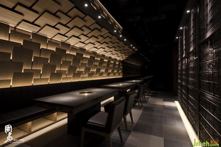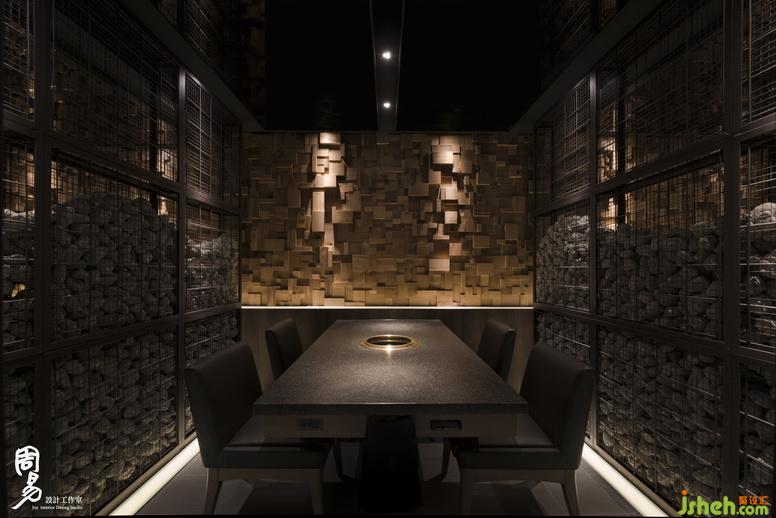 接下來,燈海水景兩邊依序安排客座列,兩翼上方刷黑的天頂,磅礡懸吊大尺度的矩形木構(gòu)造體, 造型擷取自中式窗欞的鏤空線條,在背景光襯托下,絕對是佐餐助興的最佳調(diào)劑!室內(nèi)設(shè)計師為了完成空間低調(diào)分界,在行列的卡座間,設(shè)置下襯燈光的鐵件短屏,鐵網(wǎng)界面間填入粒狀浮石,這種素材有著近 似硅藻土的特性,可以輔助調(diào)節(jié)室內(nèi)濕度,最內(nèi)側(cè)墻面以白水泥揉合稻草施作,墻間如悠游清波的 銀色魚群裝置,對話腰線下背光的山形木作飾版,與之閑情各表。包廂區(qū)延續(xù)相同金屬鐵網(wǎng)、浮石 介質(zhì),但改為至頂?shù)娜糸g模式,包廂內(nèi)部墻面采用大小不一的碎料檜木,進行多層次錯位堆棧。