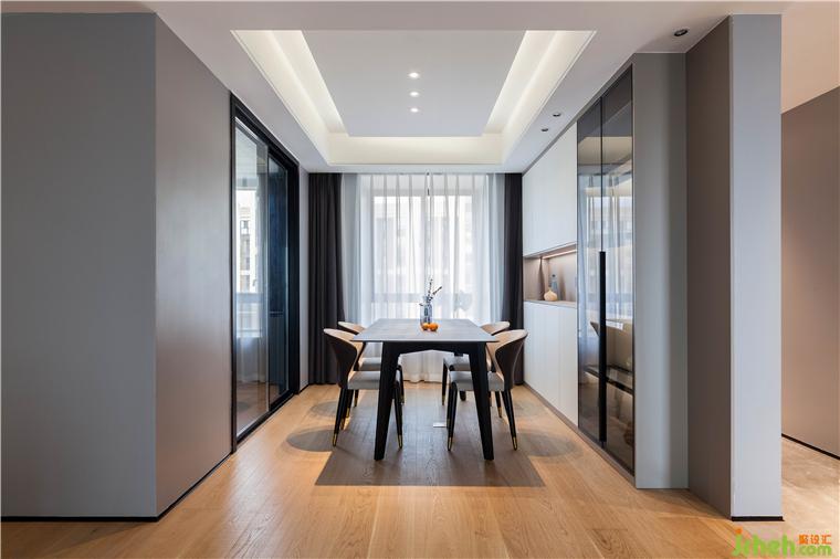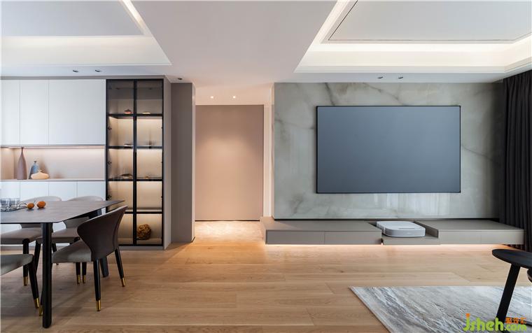 客廳空間氛圍上,希望回到家里有一種柔柔的遼闊包裹自己。把原餐廳位移出,作收納和過道部分融為一體,以大面積灰色為主,暖地面作為過渡層次,不至于太冷調,讓整個空間和色調簡約清新又不失溫馨。