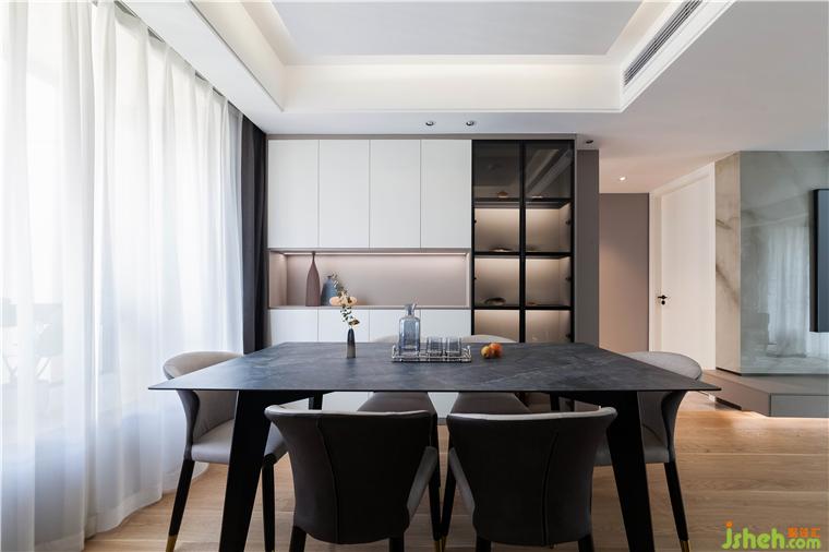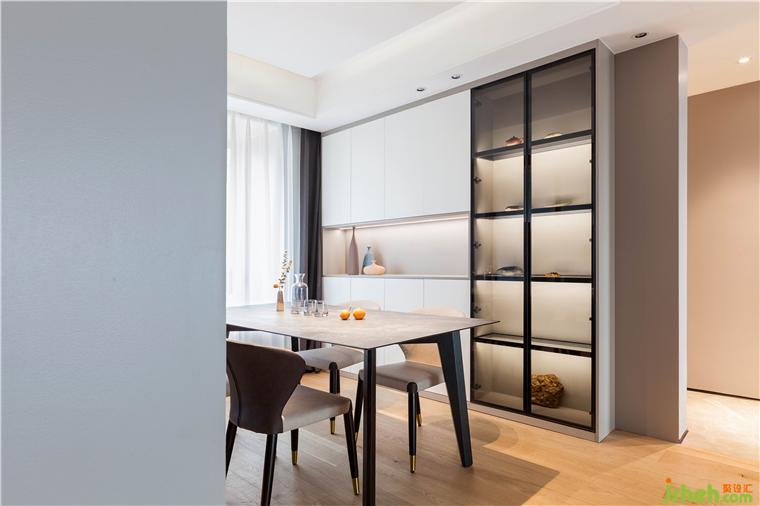 與入戶區(qū)連結在一起,以地面材質作為區(qū)分,互不干擾卻又相互陪伴,配合聚光射燈,夜晚時分在桌面投下幾個大大的暖黃光暈,用餐時光漫漫地溫柔了起來。