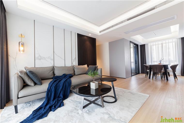 主 材: 灰色仿大理紋磚,藝術涂料,實木墻板,LED金屬條,原木地板