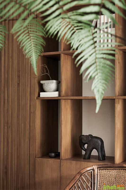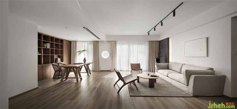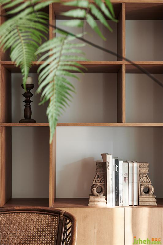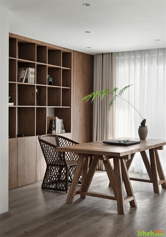 業(yè)主父母喜愛(ài)閱讀,我們?nèi)∠穗娨?,用書柜和書桌代替作為日常的休閑活動(dòng),書桌上置有茶臺(tái),喝茶看書或沙發(fā)區(qū)閑坐聊天,每個(gè)日常都充滿愜意。書柜選用原木色和不規(guī)則隔板設(shè)計(jì),沙發(fā)區(qū)背景使用留白的手法用冷靜的肌理石材調(diào)色,使得空間沉穩(wěn)。