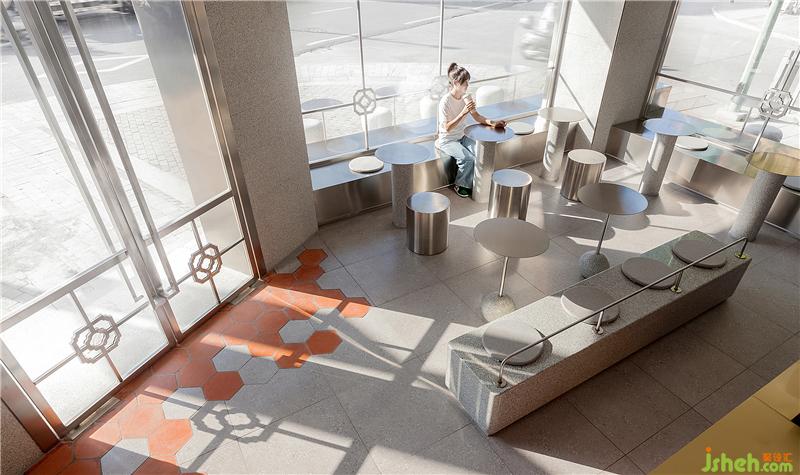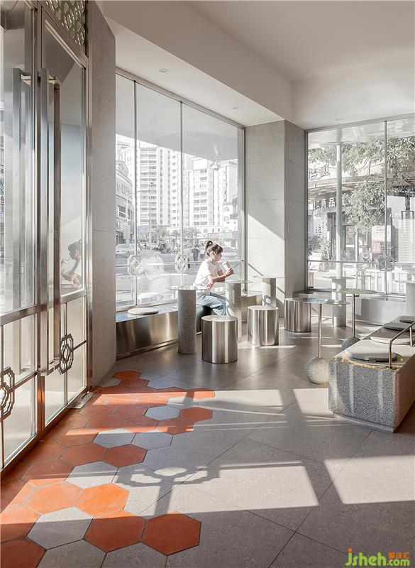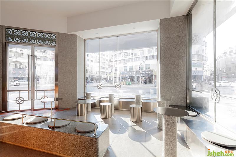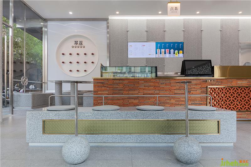 傳統(tǒng)的閩南花格與現(xiàn)代灰冷的鋼板相互碰撞,精致復(fù)古的黃銅元素點綴,以及花崗巖背景墻板間的卯榫石扣件等等,都在深度挖掘一種閩南傳統(tǒng)建筑元素與年輕化的設(shè)計語言相結(jié)合的新式閩南茶飲空間。