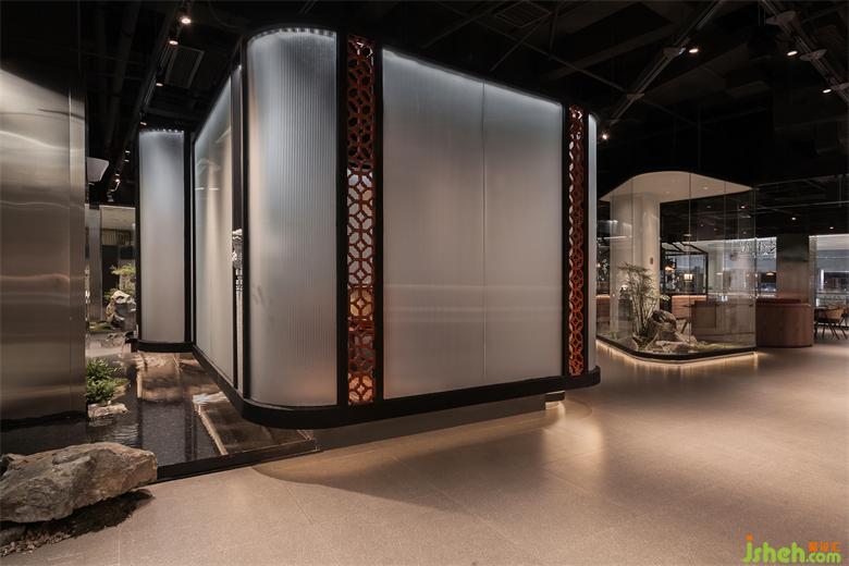 石令人幽靜,水令人曠達(dá)。造一山,有壁立千仞的峻峭;設(shè)一水,具江湖萬(wàn)里的浩渺。閩南餐廳設(shè)計(jì)空間里的閩南石材雕刻與景觀(guān)石的組合裝飾魅力在于引虛入實(shí),產(chǎn)生虛實(shí)相生、虛實(shí)互補(bǔ)的效果??臻g隨處可見(jiàn)修飾與不加修飾的石材組合裝飾,粗糙的鑿面與自然的景觀(guān)石相碰撞,構(gòu)成空間自然粗糲的質(zhì)感;而有些則用風(fēng)雨做它的鑿刀,自然沖刷的圓潤(rùn)或凹凸,以不同體量,貫穿其中,營(yíng)造游園的體驗(yàn);而家具木頭則坦誠(chéng)地舒展著它們來(lái)自天然的紋路,安放在每一次的觸感當(dāng)中。
