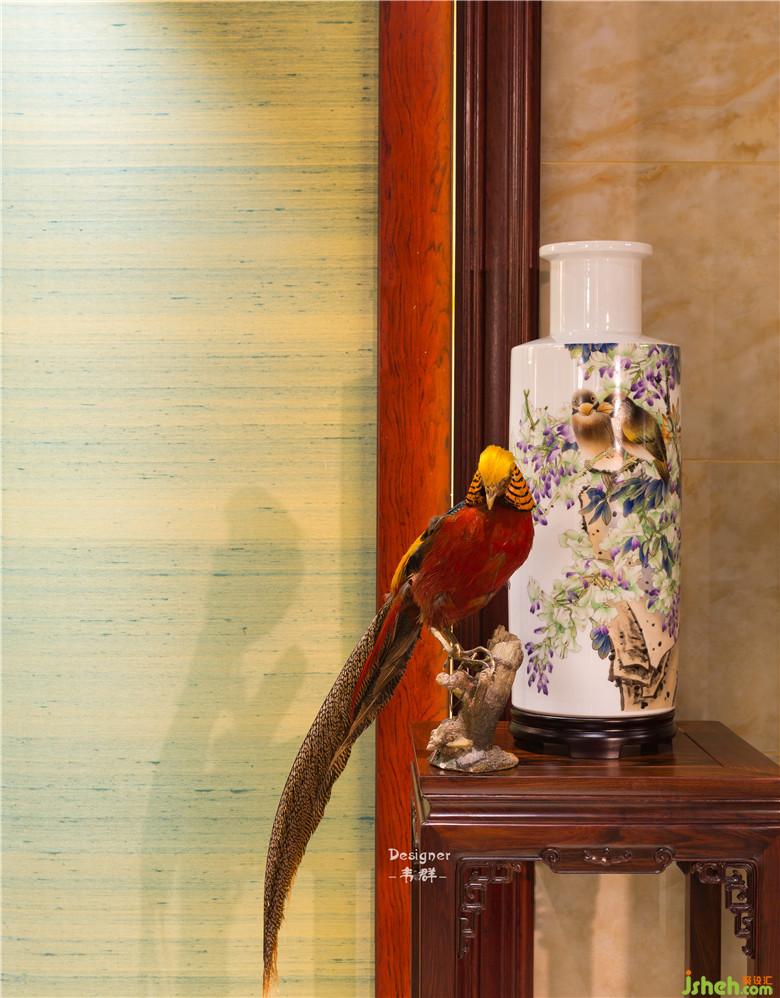 把男女主人公的愛好融入裝飾中,通過(guò)手繪墻壁紙、木飾面、大理石和花格等中式元素來(lái)表現(xiàn)傳統(tǒng)中式風(fēng)格,利用是軟裝等個(gè)性化飾品增加專屬性。