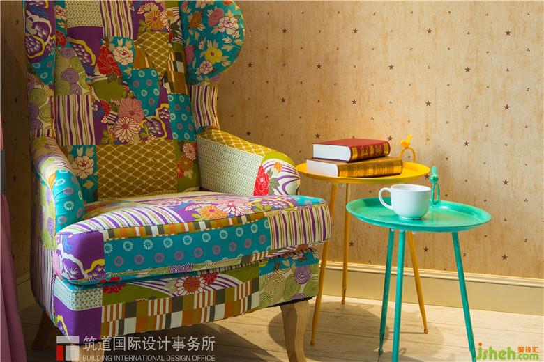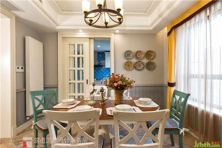 餐廳和廚房區(qū)域選用了浪漫的白色實(shí)木作為家具的主材料。廚房區(qū)域的墻磚選用了藍(lán)色釉面小方磚斜拼的鋪貼方式,與客廳的藍(lán)色色調(diào)形成一種呼應(yīng),非常規(guī)的鋪貼手法也增加了空間的趣味性。