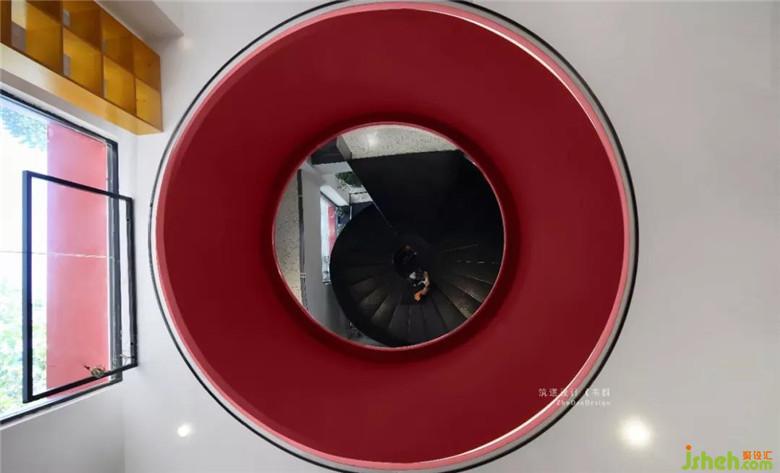 旋轉(zhuǎn)樓梯座靠窗邊,白色墻面與炭黑旋梯形成對比,簡約時尚,倍感震撼。