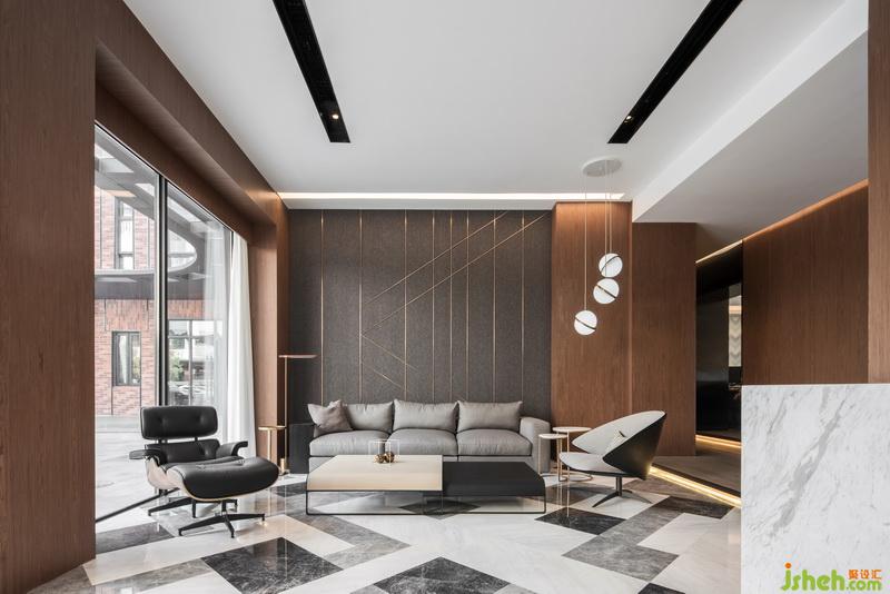 室內(nèi)設計師把辦公室以展廳的形式展示出來,進門是客廳是比較大氣的空間,大理石紋理的地面搭配硬包材質(zhì)的沙發(fā)背景墻,灰色質(zhì)感的沙發(fā),簡單藝術造型的茶幾,前臺的設計比較個性化,簡約的條線垂掛下來的吊燈,背景墻凹凸的造型在演示著不一樣的韻律。黑色玻璃鏡面搭配大理石,用金屬材質(zhì)收邊作為客廳和影音室的隔斷,通透美觀時尚。