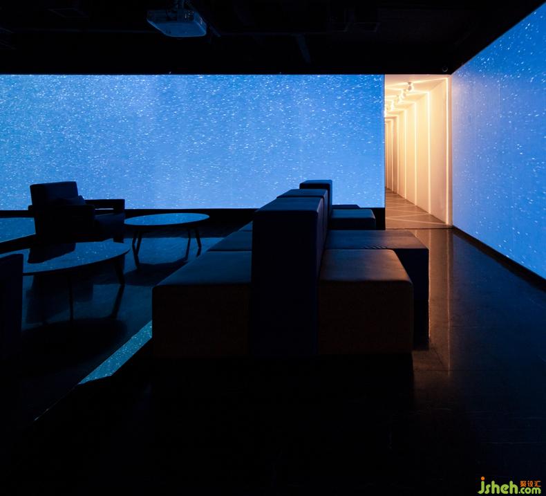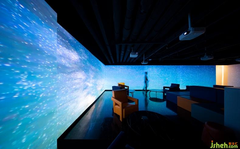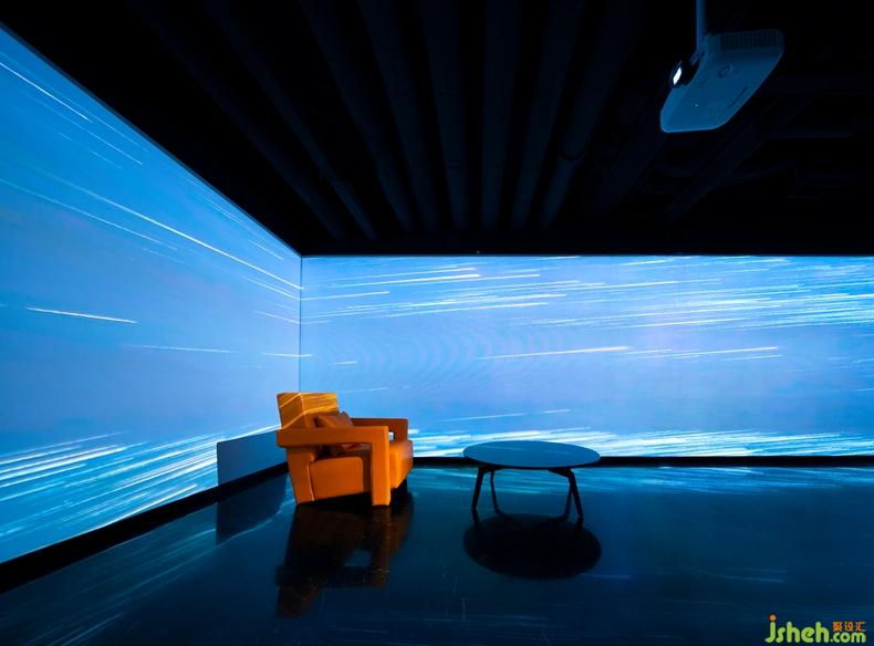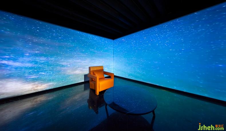 對設計師來說,設計材料不僅局限于飾面板等物理材料,更要善于運用新的概念化的材料。在本案中,設計師營造的是一個浸沒式的現(xiàn)場,利用玻璃的透明和反射原理,通過全息投影融合軟件使得投影畫面更加完整,尺寸更大,層次感更強,讓顧客在其中全方位地感受全景影像畫面所帶來強大的視覺沖擊感。深圳設計公司