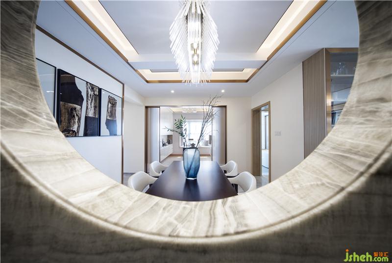 步入玄關,開闔縱橫的空間格局、經(jīng)典與現(xiàn)代的碰撞,體現(xiàn)了空間包容與開放的美學態(tài)度。鏤空圓框隔而不斷,多重材質拼接打破逼仄與沉悶,營造出通透敞亮的整體氛圍。一旁的酒柜和吧臺,于干凈利落的空間格局中融入石材與金屬, 創(chuàng)造出獨有的質感和藝術肌理,讓奔波了一天的疲憊身心瞬間放松下來。裝修公司