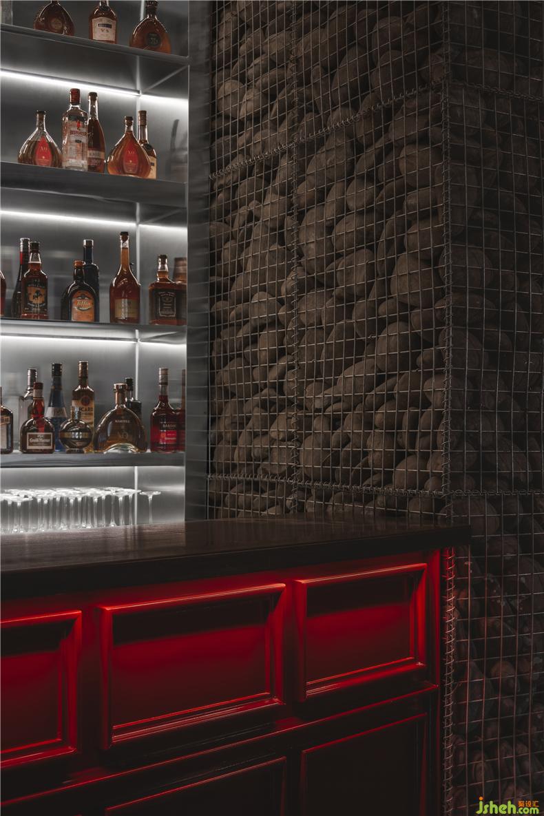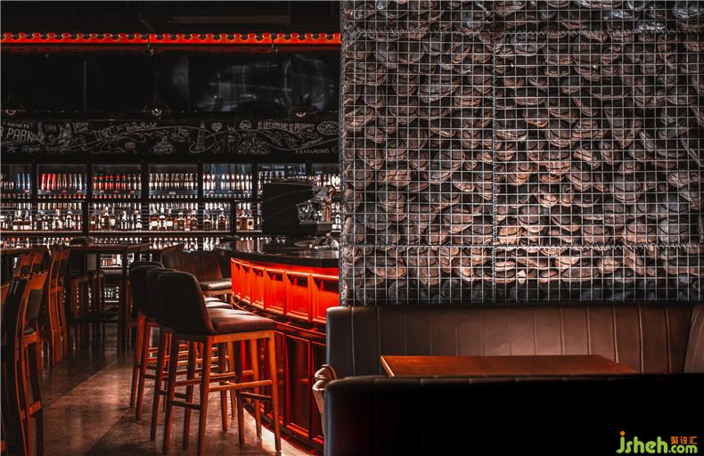 東邊的卡座區(qū)則用黑色的鐵藝網(wǎng)格分出了一個個小隔間……黑色的皮質(zhì)沙發(fā)、黑色的吊燈、黑色的裝飾鏡,這些深色的點(diǎn)綴讓這個區(qū)域的氛圍與大廳相比更具沉淀感,讓那些想享受酒精又不愿被喧囂打擾的酒客,也能在此找到隱身之所。酒吧設(shè)計