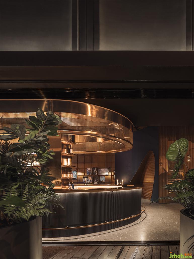 吧臺(tái)用了釉質(zhì)實(shí)木桌面和銅制金屬酒柜,這兩種材質(zhì)的結(jié)合讓調(diào)酒區(qū)兼具實(shí)用和美感,顯得復(fù)古而摩登。酒吧設(shè)計(jì)回形的長(zhǎng)桌既使室內(nèi)向室外的延伸,又讓人流動(dòng)線產(chǎn)生更多的交互,美酒讓拱形酒架猶如璀璨的藝術(shù)品,它兼顧了實(shí)用與美觀,方便讓調(diào)酒師們更好地掌控全局。