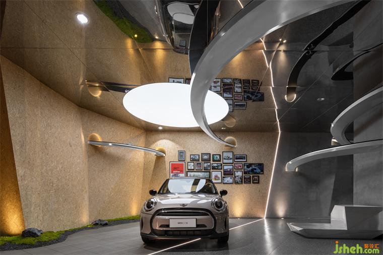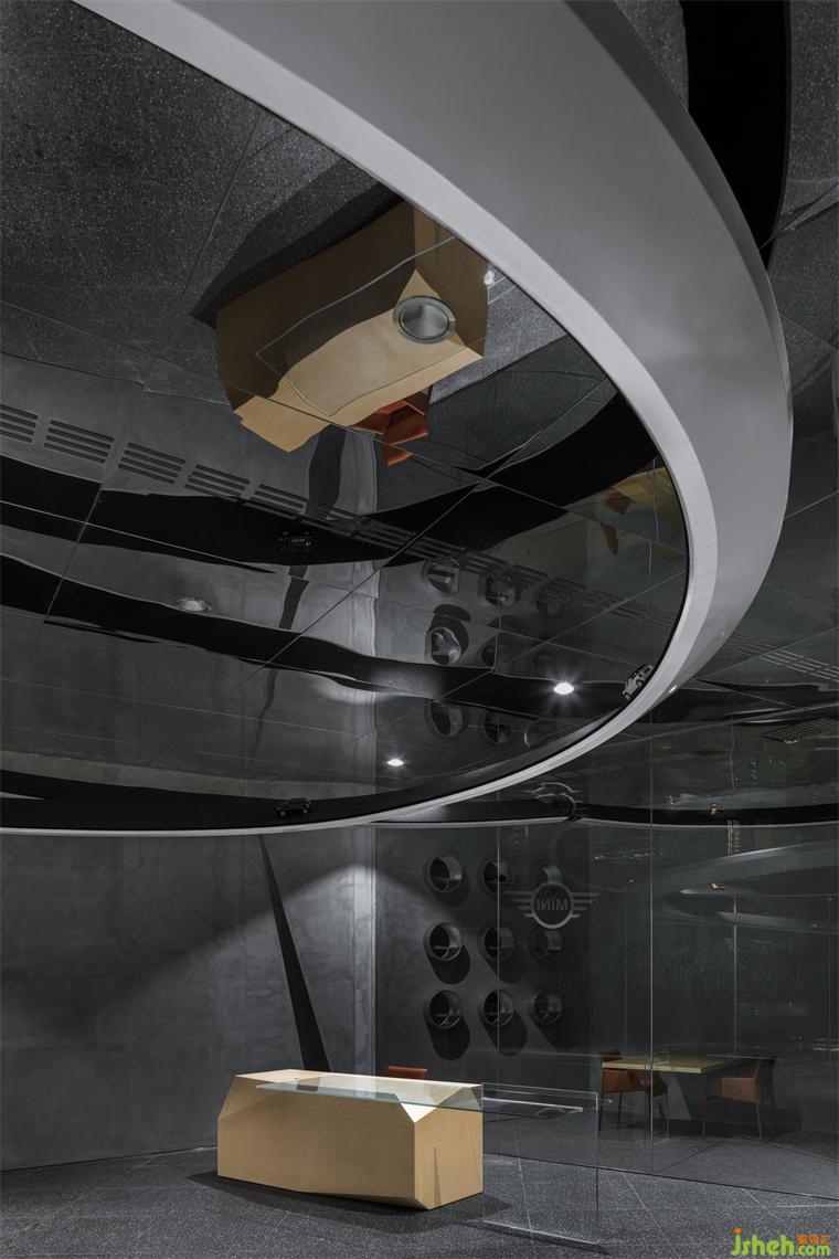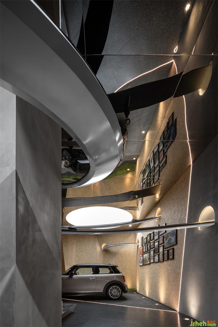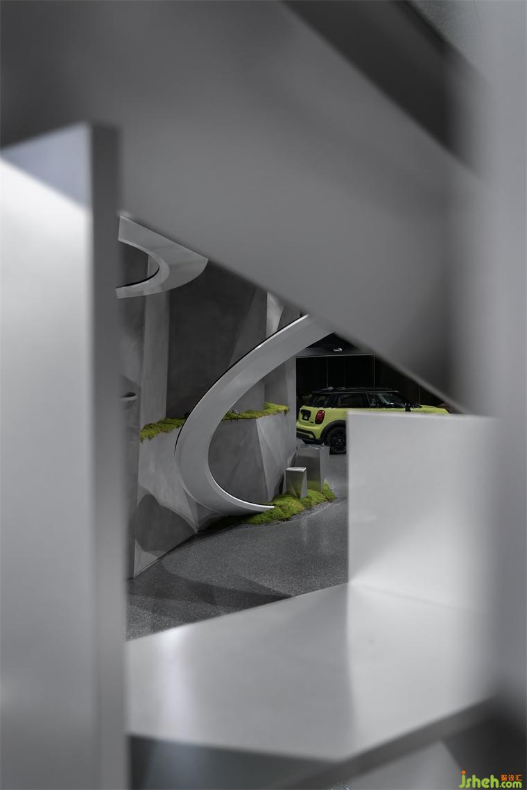 穿插旋繞在各處的跑道賦予空間極具張力的動勢屬性,是品牌內(nèi)核理念飛馳的有形載體,展廳設(shè)計(jì)外化MINI“自由自在”的精神性追求,但看似隨意穿行的跑道實(shí)則精心構(gòu)造。