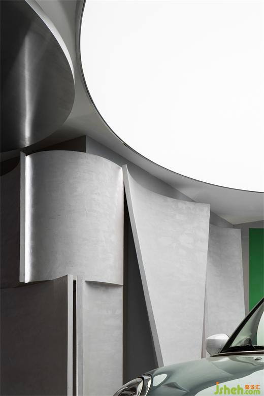 踏入展廳的瞬間仿佛被拉升了次元界限,平滑自洽的各類弧線如波浪般拓開人的官能感知邊緣,目光隨線條的起伏變幻即可將整個空間盡收眼底。與柔化的背景設(shè)計元素相對應(yīng),客戶體驗中心設(shè)計師以鮮明跳脫的色彩突出核心元素,墨綠、橘紅、靛藍等重點色的應(yīng)用呼應(yīng)了展車的不同風格,既清晰劃分各功能區(qū)域,亦保持無拘無界的觀感體驗。