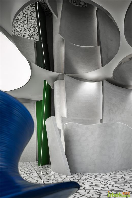 “微瀾匯聚即成巨浪”,空間造型靈感來源于波浪,設(shè)計師利用GRG材質(zhì)塑造墻面與吧臺的弧度造型,曲度各異的線條交錯匯集,描繪出海浪交疊的輪廓,賦予空間奔騰流動的生命感。海浪既有包容兼收的文化特性,客戶體驗中心設(shè)計又含變革沖突的力量感,在展廳中多維呈現(xiàn)波浪造型,不僅能夠以豐富的線條變化拉伸空間視覺層次,更將包容變革的精神力爆發(fā)式地具化表現(xiàn)出來。