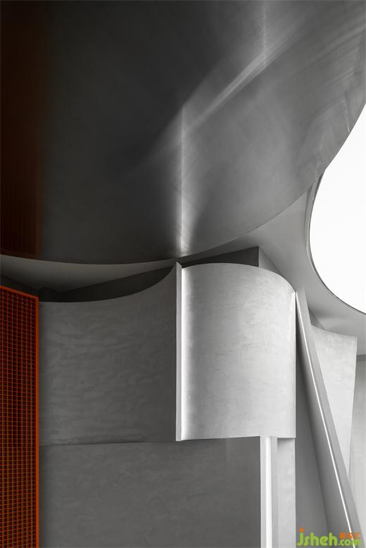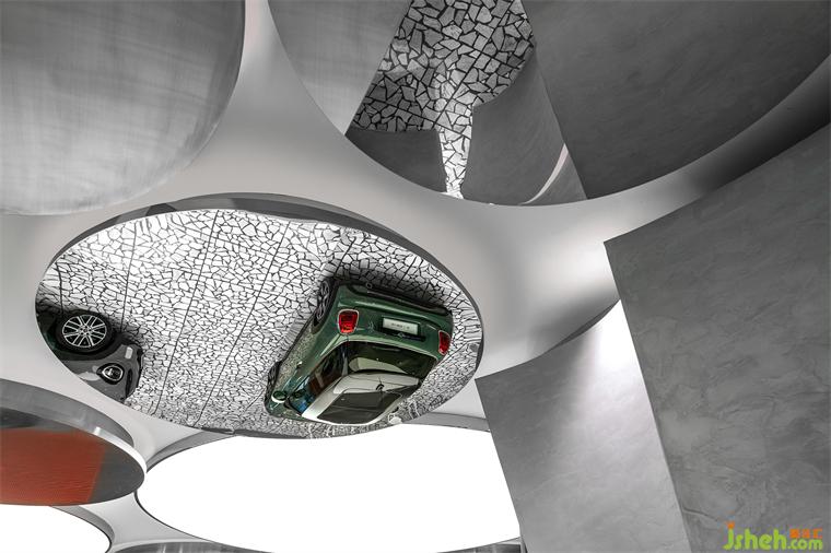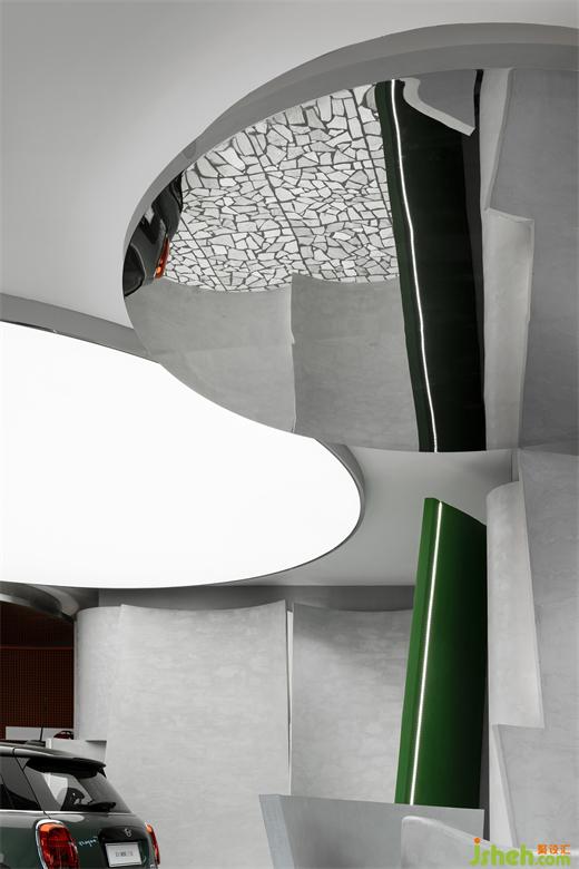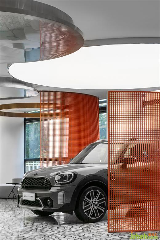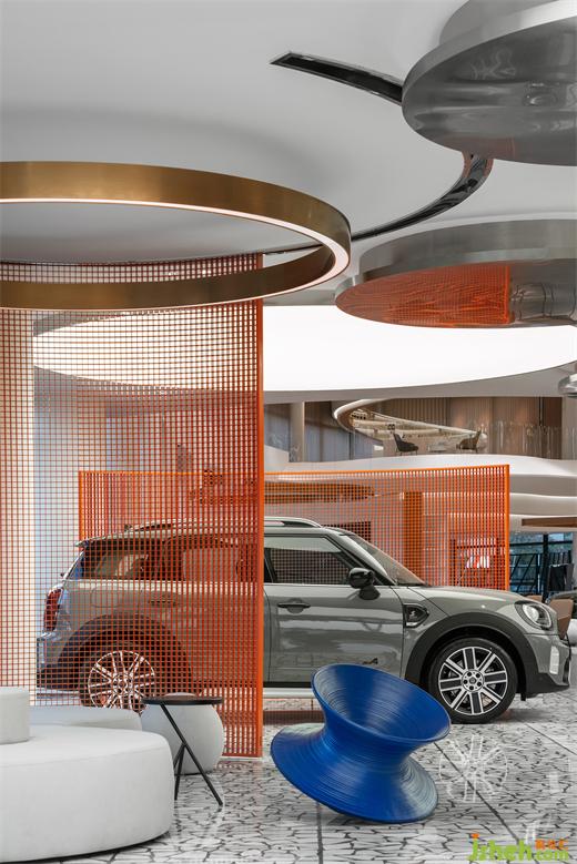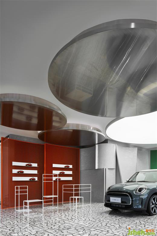 寶馬MINI的強(qiáng)大精神力來源于從不同客戶的人生經(jīng)歷中汲取內(nèi)驅(qū)力量,展廳作為品牌精神的具象表達(dá),更須凸顯MINI集眾所愛、自成風(fēng)尚的個性特質(zhì)。為此,設(shè)計師選擇多元材質(zhì):微水泥質(zhì)感墻面、客戶體驗中心設(shè)計圓形鏡面不銹鋼局部吊頂、橙色不銹鋼置物架、水磨石地面預(yù)制板……不同材質(zhì)的糅合渲染出戲劇性的碰撞與反差,形成意象與現(xiàn)實的重疊、對立,將空間向度引向未來,筑成一域映照現(xiàn)實又鏈接未來的馭美空間。
