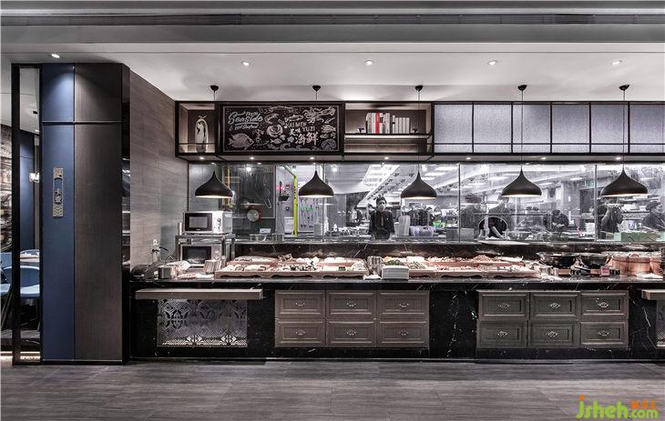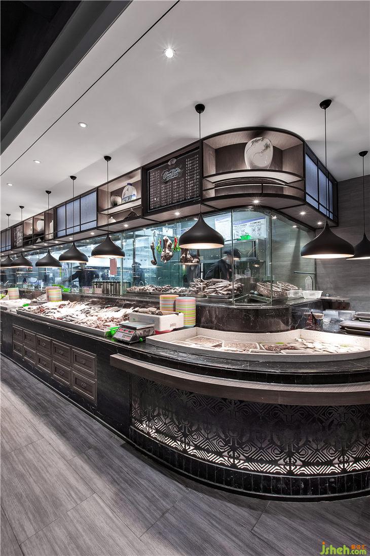 點餐區(qū)也是大廳的重要組成部分,是整個空間的亮點之一,冰鮮臺由中式的抽屜和傳統(tǒng)圖案組合而成,錯落有致。裝飾架上的藝術(shù)擺件裝飾與描繪著海鮮圖案的小黑板,如同鬧市中的廣告牌一般,安靜地訴說著市井文化故事,場景性的設(shè)計加快了就餐者的適應(yīng)性和感官上的滿足度。