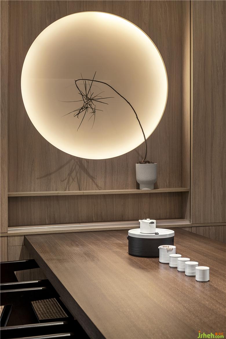 皮質沙發(fā)與空間的茶幾給人以“山”的層疊之感,“松”的寧靜沉浸了浮躁的心靈。