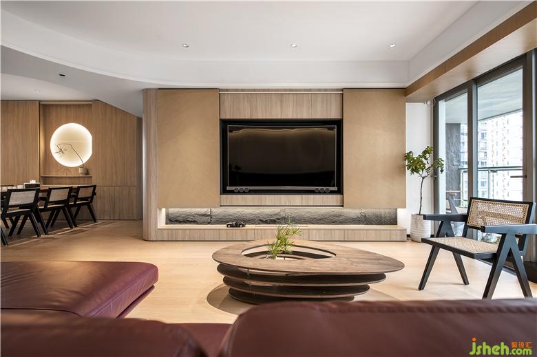 電視柜精致的木飾面局部糅合了石材的紋理,形成粗礦與精細的對比。