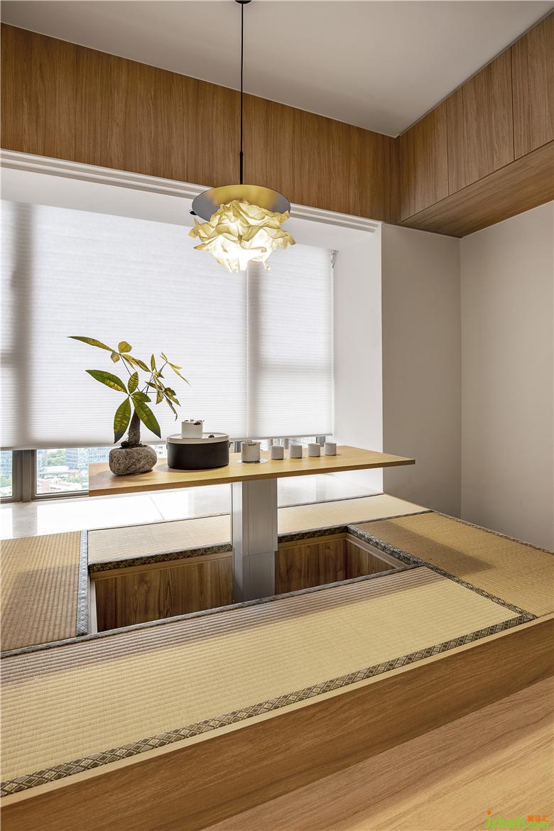 設(shè)計師在純凈的木色空間中,降低了裝飾性的干擾,“一輪明月”位于空間中央,方中帶圓,光影之中點綴一株植物,布局的素雅與木質(zhì)的溫潤給人一種寧靜溫馨。