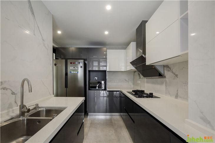 廚房:白色高柜,黑色矮柜搭配暖灰的地磚和雅白的墻磚,廚房這個原本應(yīng)該是煙火氣息濃重的空間也可以同樣的雅致有趣