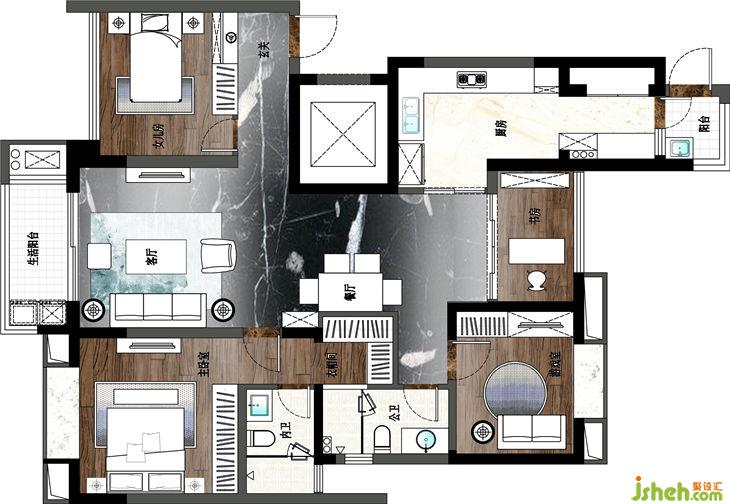 平面布置圖:平面布局上滿足客戶的特殊要求,雖是四房格局,但最終呈現(xiàn)的是兩居的狀態(tài)。原格局主臥儲物空間相對較少,為實(shí)現(xiàn)業(yè)主有一個獨(dú)立衣帽間的愿景,在東北角次臥和外衛(wèi)上做了非常大的調(diào)整,最終達(dá)成業(yè)主所想。