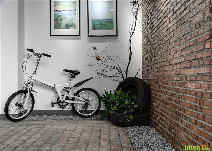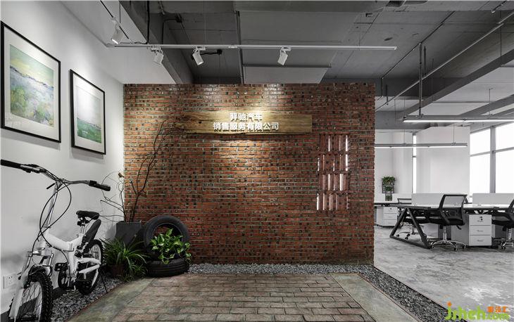 85紅磚素貼,原木板打底配白色雪弗板LOGO字。紅磚溝縫平鋪的地面左右各留40公分水泥材質(zhì)的地面和辦公區(qū)水泥地面呼應(yīng),四周對稱各留30公分放置小石頭強調(diào)玄關(guān)區(qū)域。設(shè)計公司