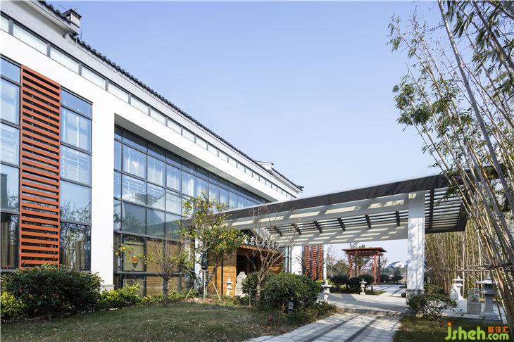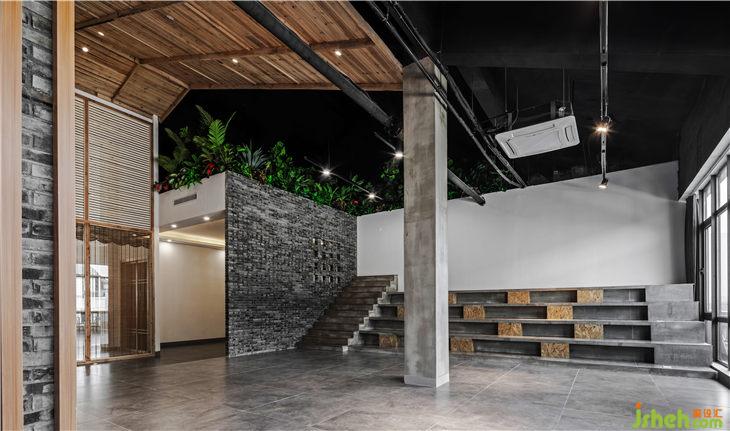 東西兩邊入口,白色乳膠漆墻面與江南常見的灰磚兩相呼應(yīng),頂部預(yù)留足夠的空間設(shè)立屋頂花園。讓屋頂內(nèi)再有屋頂,不同空間之間有效得到緩沖,同時(shí)解決高度不一,材質(zhì)不一造成的節(jié)點(diǎn)收口問題。模塊化的玻璃隔斷有規(guī)律的一字縱向展開,用來分隔兩種不同功能分區(qū)。立面上一分為二,解決6米多層高帶來的困惑,材料上采用原木木方呼應(yīng)公共區(qū)域的吊頂材質(zhì)。