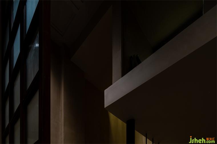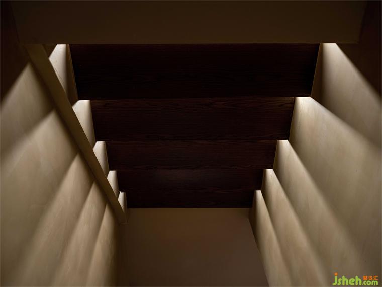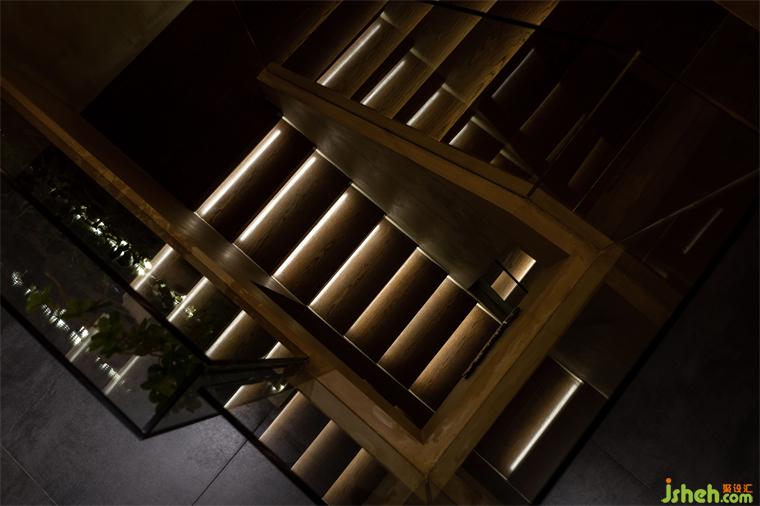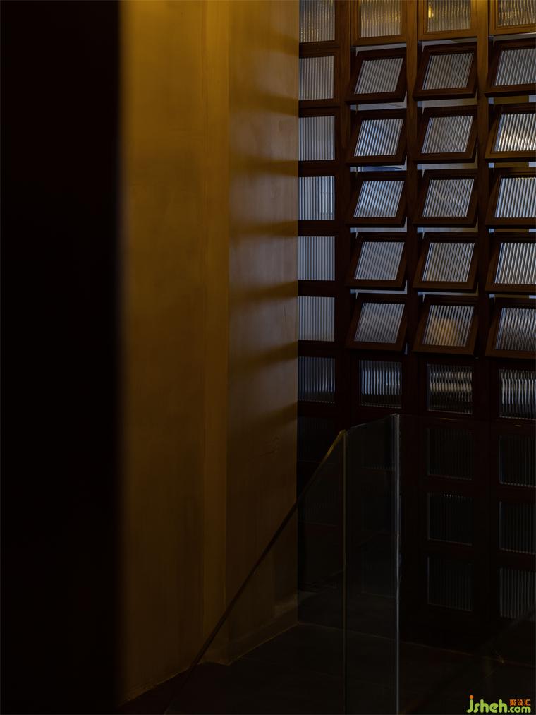 通過增設夾層的方法,大面積的轉折平臺既延緩了上樓梯的尺度問題,又擴大了實用空間及景觀氛圍。懸空的樓梯踏步彌補了尺度上的不足,同時在結構上也讓空間節(jié)奏變得更有秩序。夾層與一樓產(chǎn)生的高差,餐廳設計制造了可觀可望的空間趣味和朦朧的意境。