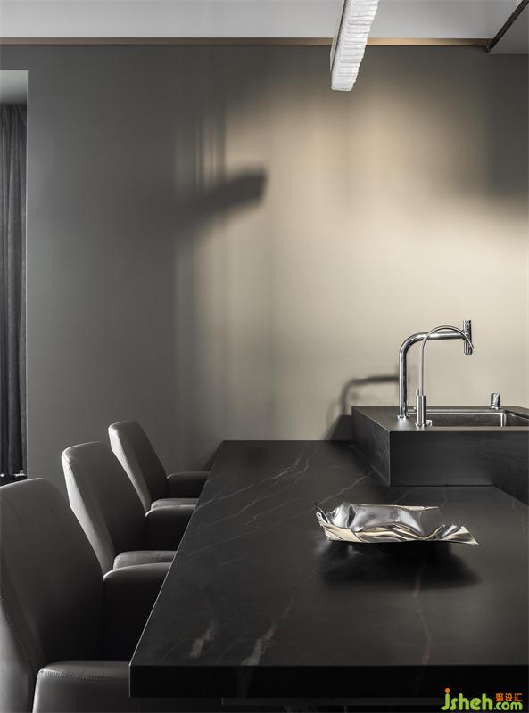 深色的高亮光大理石瓷磚猶如一片寧靜的湖面,倒影著空間的每一處風(fēng)景,室內(nèi)設(shè)計(jì)師讓僅有2.4米的層高隨著視線的上下移動,給空間帶來更高尺度感。以空間的反映,簡單之中蘊(yùn)含精致,呈現(xiàn)一場視覺盛宴。