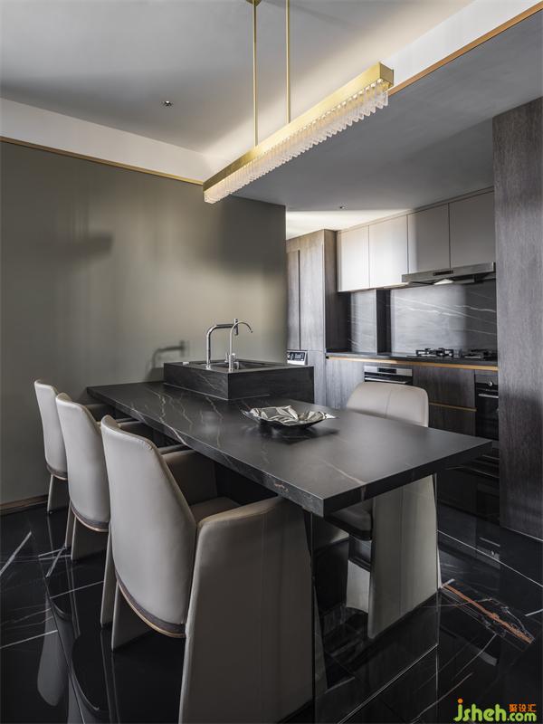 透過窗戶,在陽光余輝的照射下,隨著時間的推移,在動與靜之間,形成一種可變化的空間,室內(nèi)設(shè)計(jì)師使得原本稍帶深沉的氛圍多了一絲溫暖明媚。開放式廚房島臺連接餐桌的設(shè)計(jì),省去了單獨(dú)餐桌的位置,擴(kuò)大了客廳面積,打造了一個自由開放的空間,讓廚房更加寬敞,也讓視野更加開闊,在用餐的同時也多了一份儀式感。