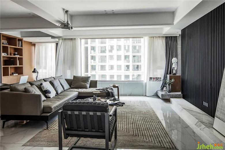 ▲ 利落的線條,起伏的光線,裝修公司把理性思維和浪漫情懷充分地融合在了一起。黑色的KD板沉淀出高級感,搭配120寸的家庭影院系統(tǒng),整個客廳有趣、有品,而且一點也不高傲,設(shè)計師將客廳的個性和狀態(tài)拿捏得剛剛好。