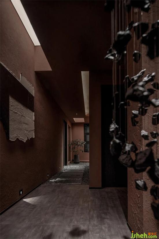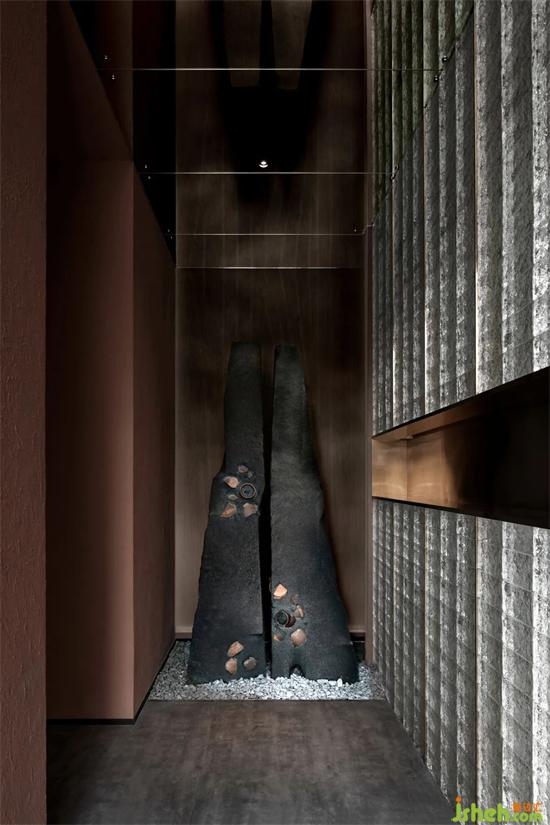 入口的端景,是一塊從中間劈開的石塊,述說著盤古開天辟地的傳奇故事。左邊的夯土墻,地面的碎石,似乎帶酒館設(shè)計(jì)我們來到那個(gè)遠(yuǎn)古的時(shí)代,那是文明的起源,人類智慧的開始。