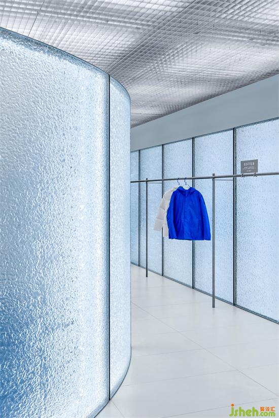 雪消又冰釋,水波紋玻璃在四周環(huán)繞,一切都像是被添上了一層縹緲的濾鏡,包裹感在此處擴(kuò)散開來,上海專賣店設(shè)計特殊材質(zhì)的肌理感帶來平靜與起伏的碰撞感。