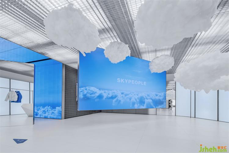 在空間的核心區(qū)域,我們?cè)O(shè)置了一組LED與鏡面錯(cuò)位擺放的通道,空間被折射、反射,觀看視角會(huì)發(fā)生改變,或是在云端,或是在倒置,這是一種用簡(jiǎn)潔而有力地用空間體驗(yàn)區(qū)去表達(dá)“天空人”的方式。