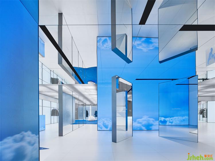 屏幕所表達(dá)的動(dòng)態(tài)關(guān)系、空間的相對靜止、體驗(yàn)者的行進(jìn)過程三者之間形成一種冰凍廣場的呼吸節(jié)奏。而在天空人以及冰凍廣場的表達(dá)中,看的視角與行走的狀態(tài)是一種非常有趣的內(nèi)容,互動(dòng)屏有非常多表達(dá)可能性,可以在時(shí)間上做到與真實(shí)城市空間同頻,也可以展示完全不同的“天空人”視角的行走狀態(tài),上海專賣店設(shè)計(jì)更多的是一種態(tài)度與狀態(tài)的表達(dá)。我們希望能用這種特殊的觀看方式引起用戶的好奇感,駐足,并且探索。